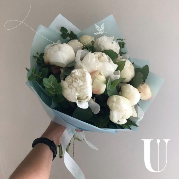 Монобукет из белых и синил лизиантусов в стильной упаковке