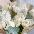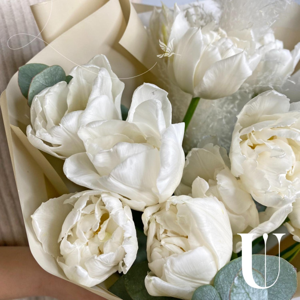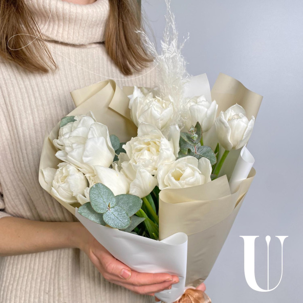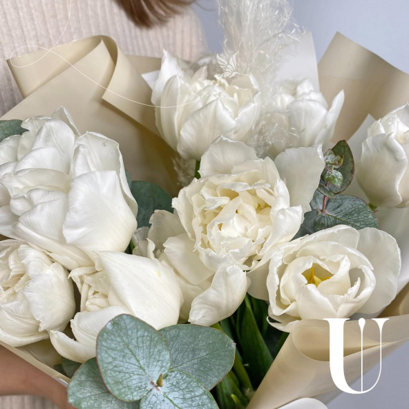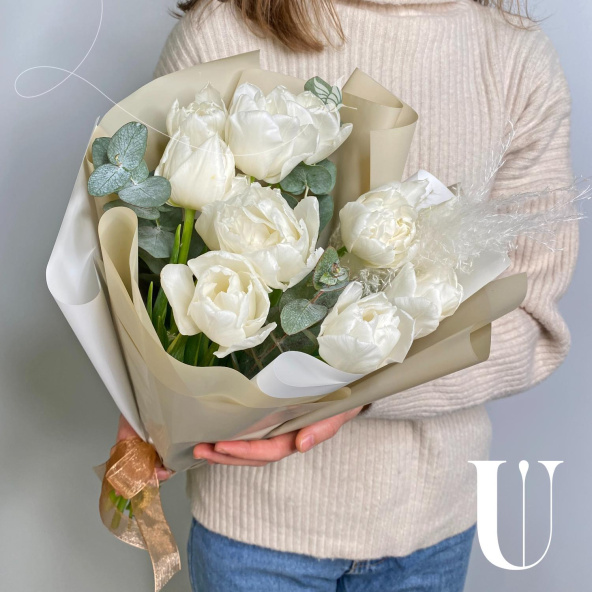 Монобукет из 15 белых тюльпанов в крафтовой упаковке