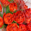 Монобукет из роз сортов Гран-При и Вау в оранжевой упаковке