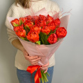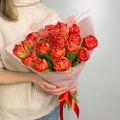 Монобукет из 9 красных кустовых роз сорта Мирабель в дизайнерской упаковке