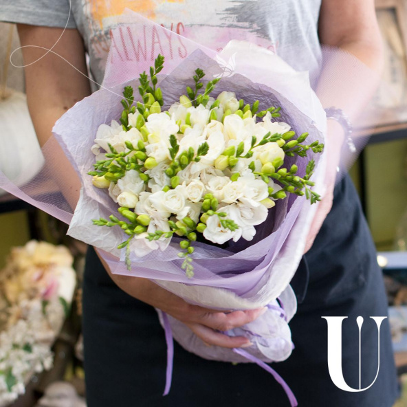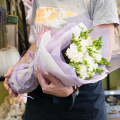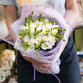 Монобукет из белых кустовых роз и синего лагуруса в крафтовой упаковке