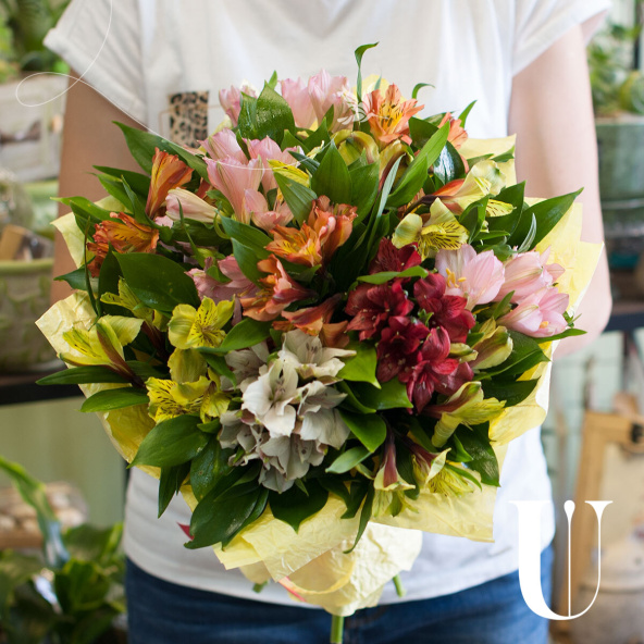 Букет из 11 альстромерий микс с зеленью в упаковке