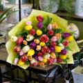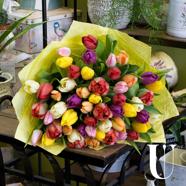 Монобукет из 49 белых тюльпанов в дезайнерской упаковке