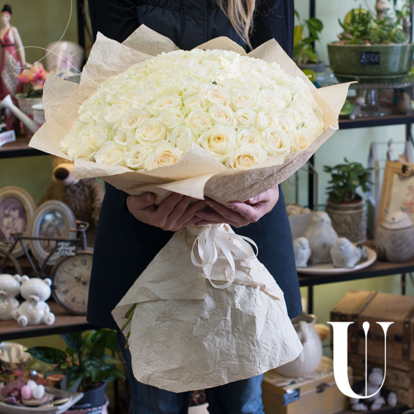 Огромная охапка и 125 белых тюльпанов в стильной упаковке вызовет большой восторг