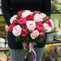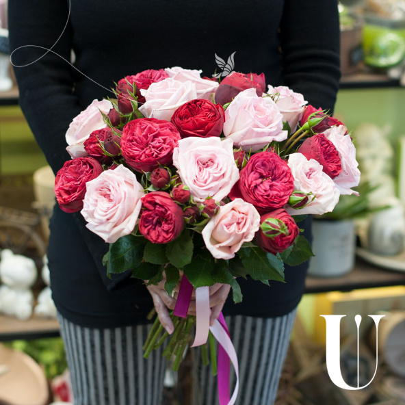 Монобукет из кустовых пионовидных роз Бомбастик в дизайнерской упаковке