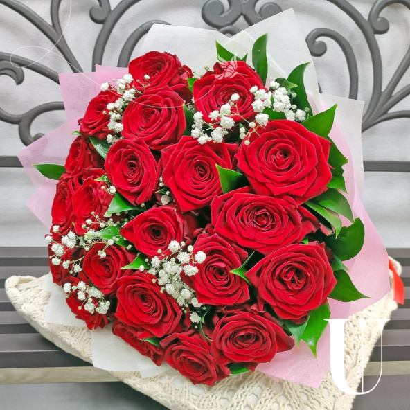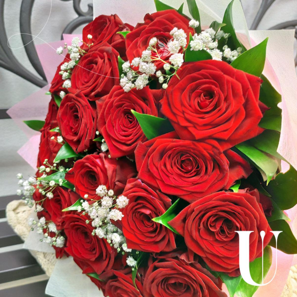 Роскошный, страстный и элегантный букет из красных французских роз сорта Нина
