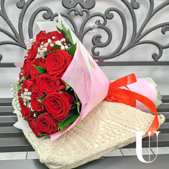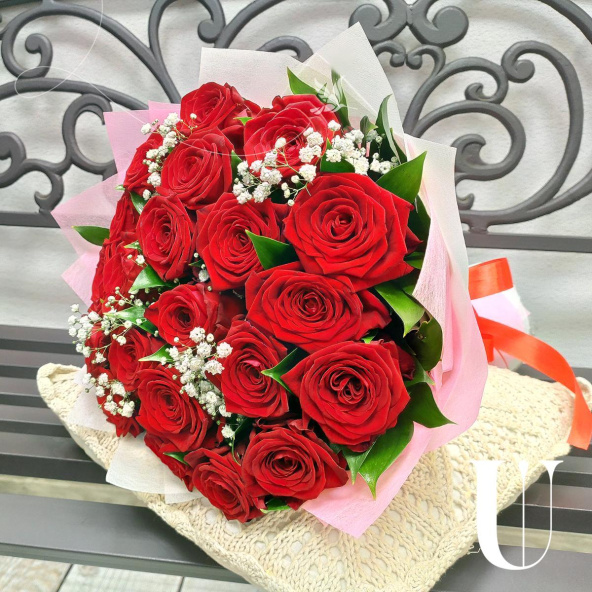 Монобукет из 15 роз сорта Валентина 60 см в упаковке