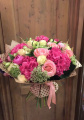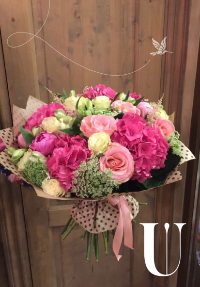 Гортензия, роза одноголовая, роза кустовая, пион, альстромерия, трахелиум, упаковка, лента