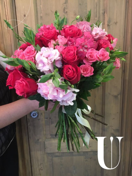 Гортензия, роза одноголовая, роза кустовая, эустома, салал, лента.