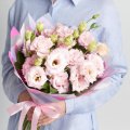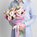 Монобукет из розовых кустовых роз сорта Лидия в упаковке