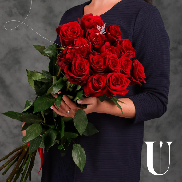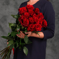 Монобукет из 25 роз огненных роз сорта Атомик 60 см в упаковке
