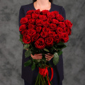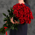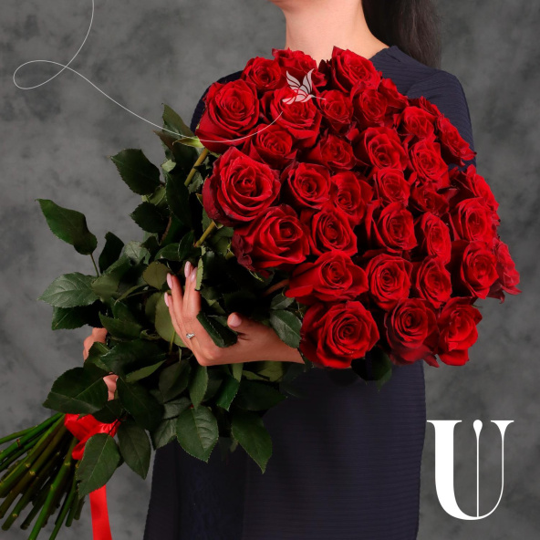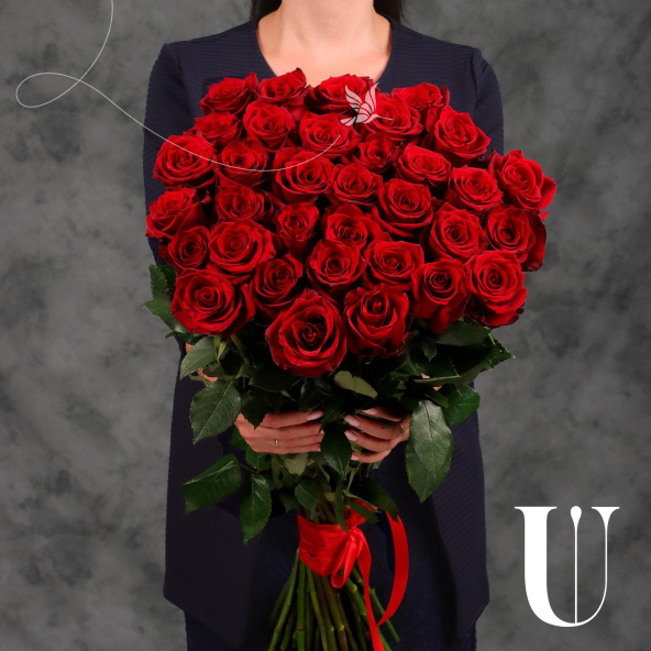 Монобукет из роз сорта Пинк Флойд с атласной лентой