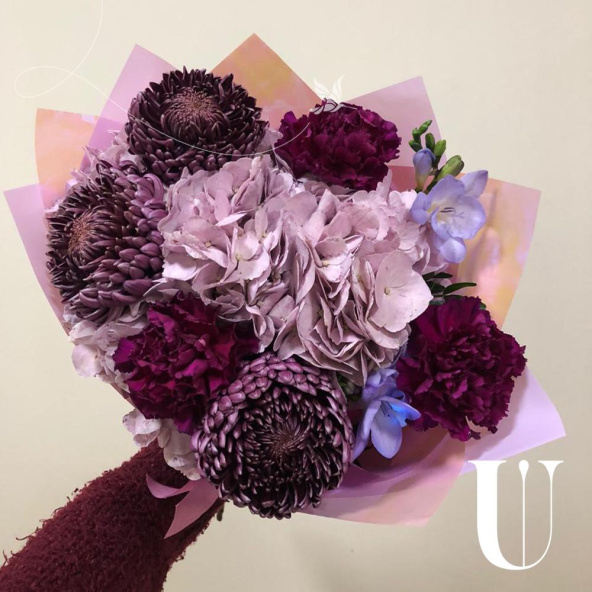 Микс из фиолетовых и кремовых диантусов в дизайнерской упаковке