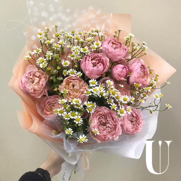 Нежные кустовые пионовидные розы в дизайнерской упаковке