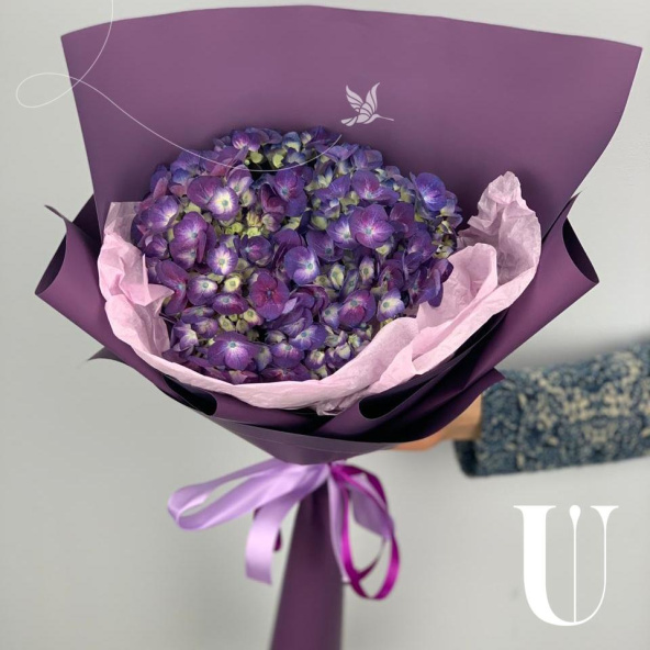 Монобукет из голубой гортензии в дизайнерской упаковке