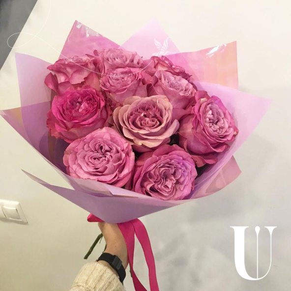 Монобукет из 9 роз сорта Пинк Охара в дизайнерской упаковке