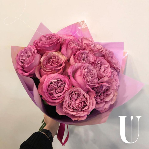 Монобукет из кустовых пионовидных роз Джульетта в дизайнерской упаковке