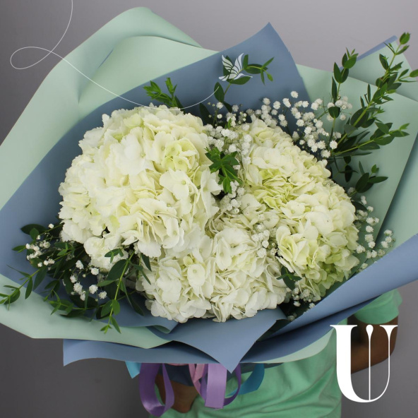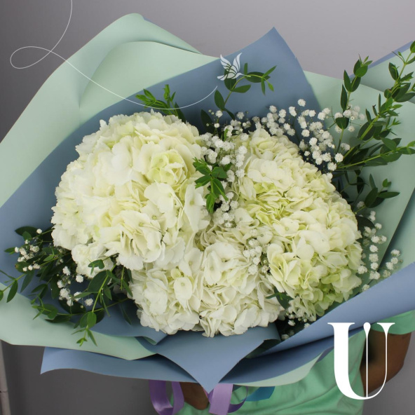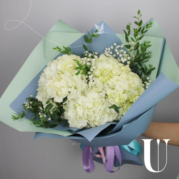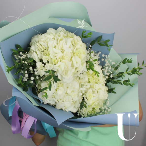 Монобукет из белых тюльпанов и белой гипсофилы в упаковке