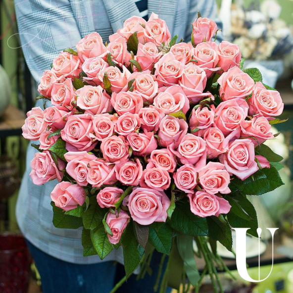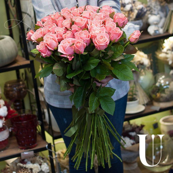 Монобукет из 51 розы сорта Мисс Пигги в крафтовой упаковке