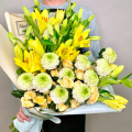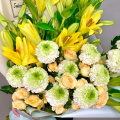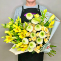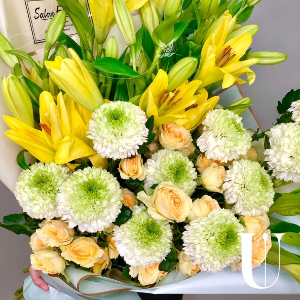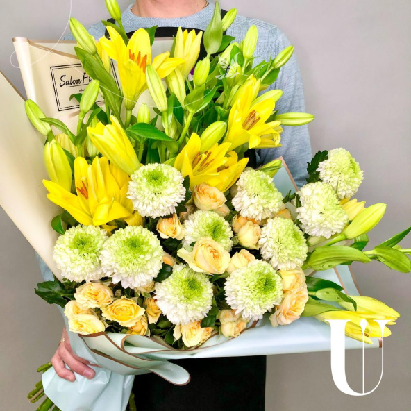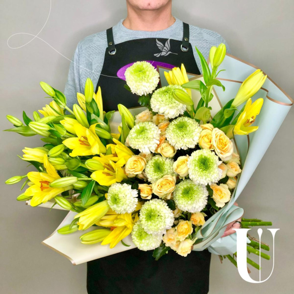 Большой букет из микса кустовых хризантем в дизайнерской упаковке