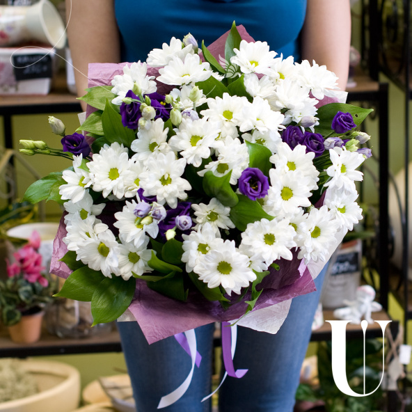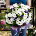 Монобукет из белых кустовых хризантем в лавандовой упаковке