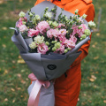 Монобукет из розовых кустовых пионовидных роз в упаковке