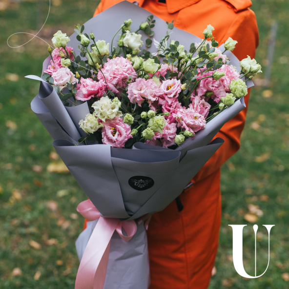 Нежные кустовые пионовидные розы в дизайнерской упаковке
