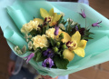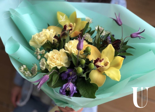 гвоздика, орхидея цимбидиум, гиперикум, клематис, салал, упаковка, лента
