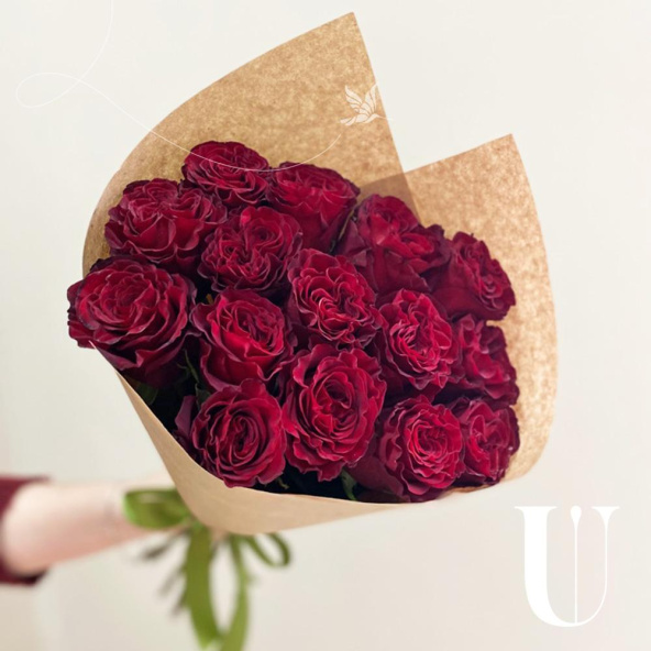 Монобукет из 15 вывернутых роз сорта Нина в матовой упаковке