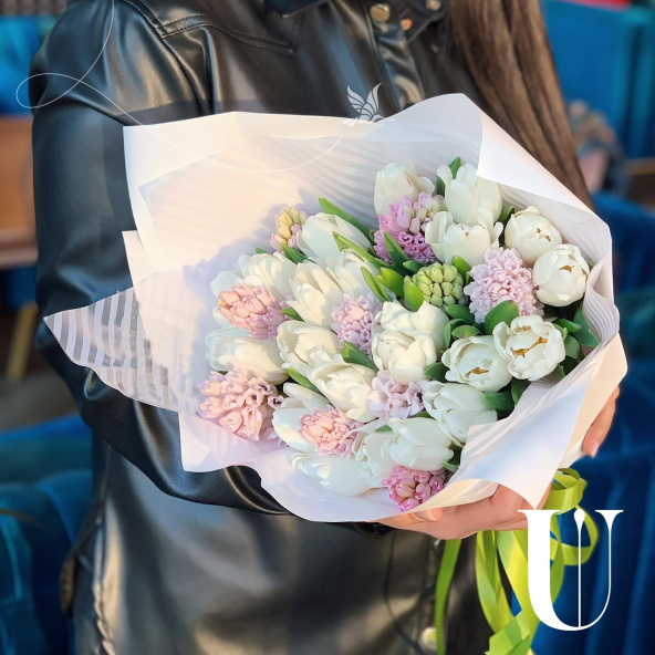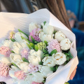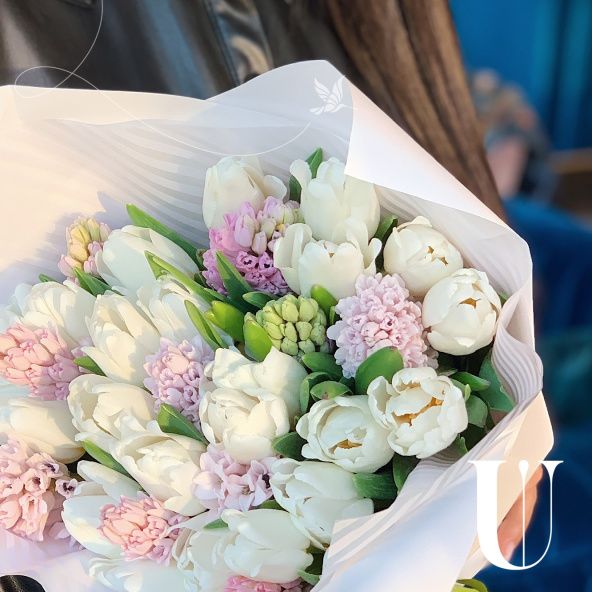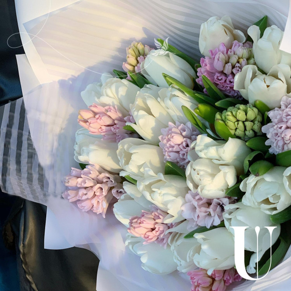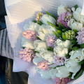 Белые тюльпаны - 25 штук, гиацинты розовые - 10 штук, упаковка пленка
