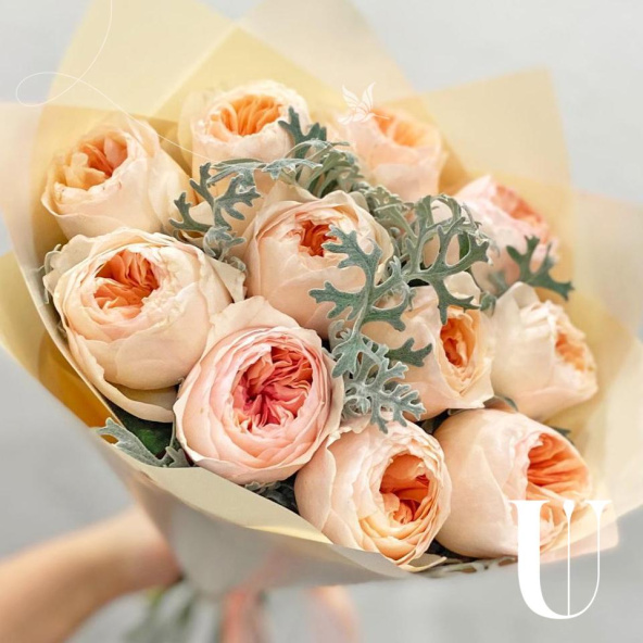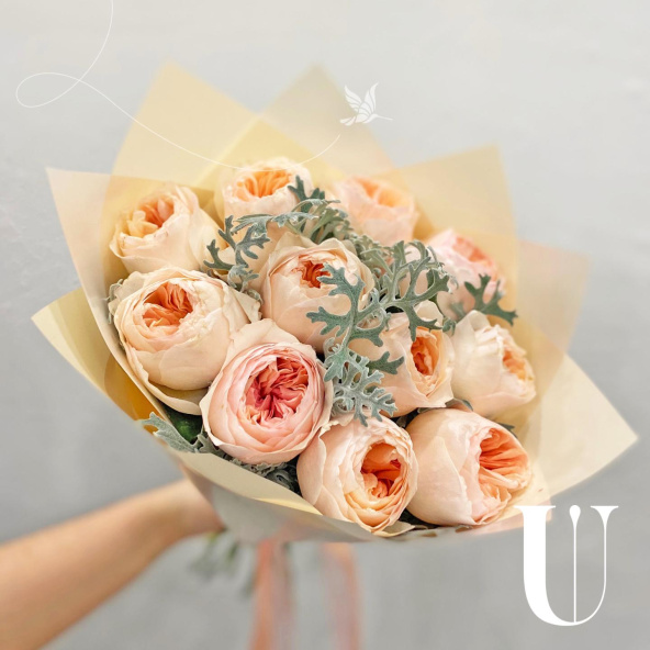 Пионовидная роза - 11шт, сенецио - 4шт, упаковка