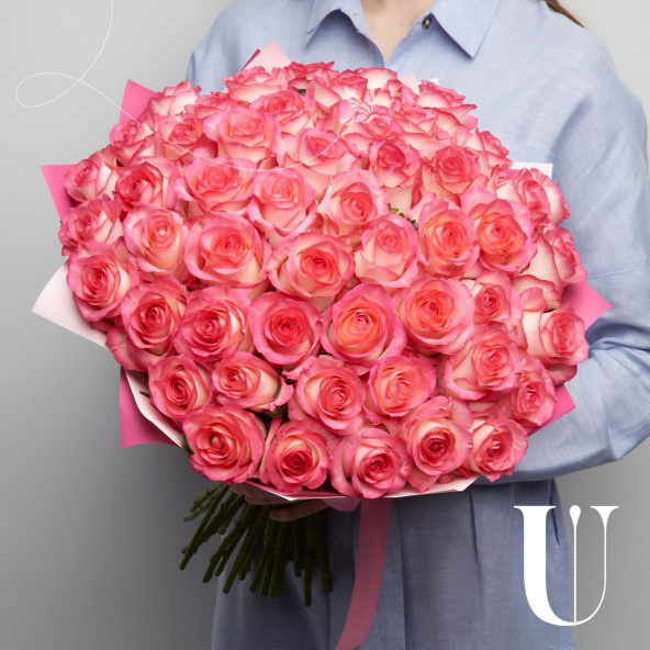 Монобукет из малиновых роз и роз Пинк Мондиаль в упаковке