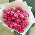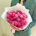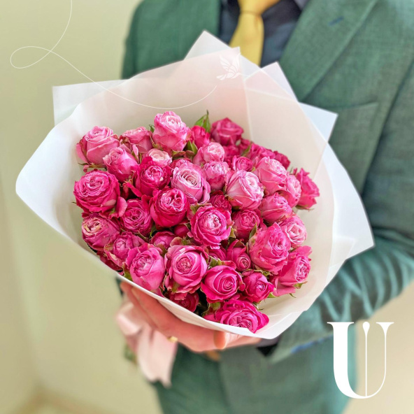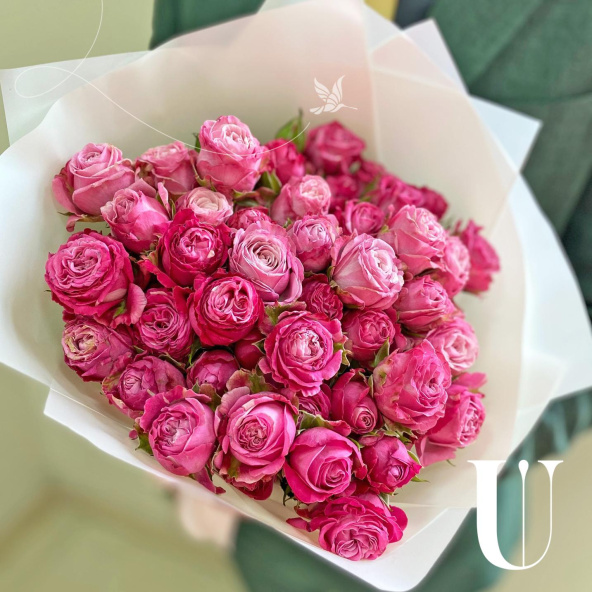 Монобукет из кустовых роз сортов Лидия и Яна в розовой упаковке
