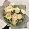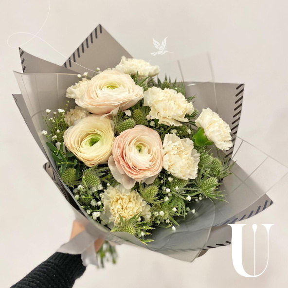 Ранункулус-3шт, гвоздика-7шт, эрингиум зеленый-5шт, гипсофила-2шт, упаковка