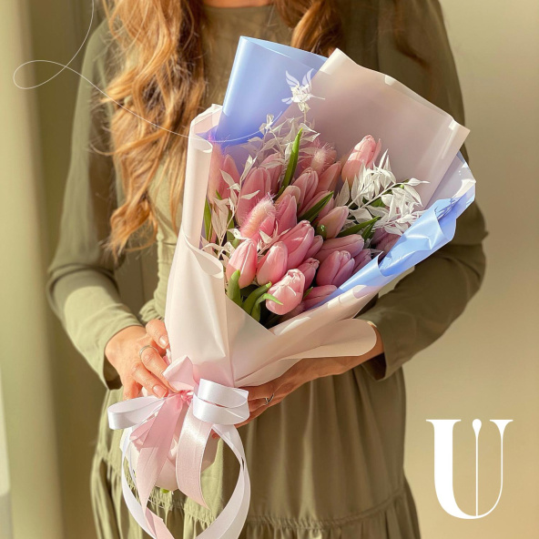 Мини-букет из 15 розовых тюльпанов в крафтовой упаковке