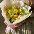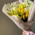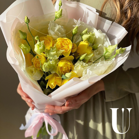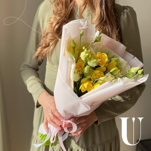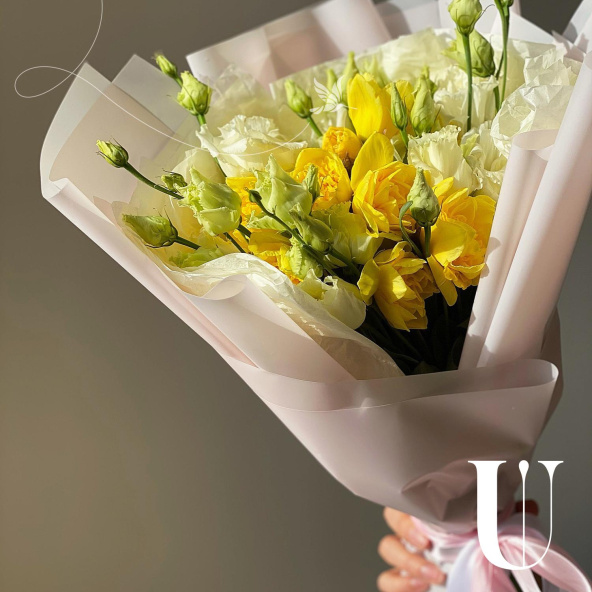 Солнечный нарцисс - 9 шт. и кудрявая белая эустома - 5 шт.