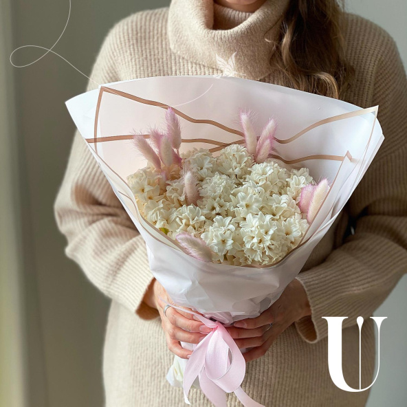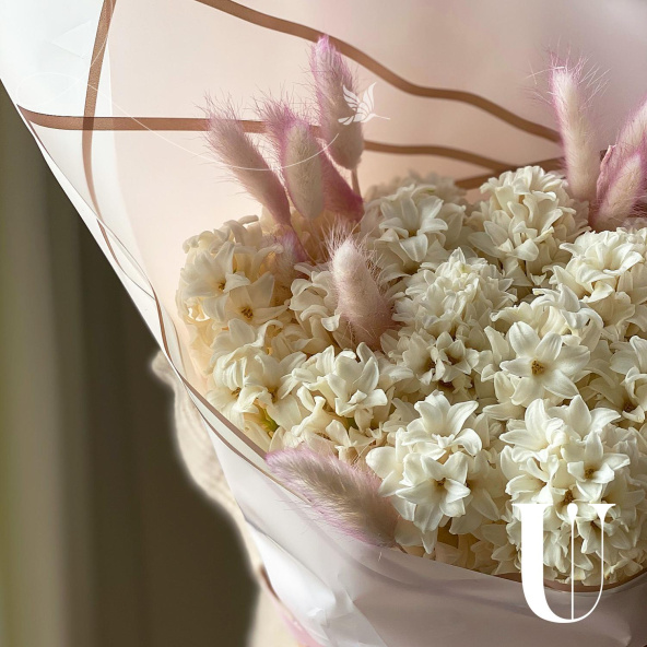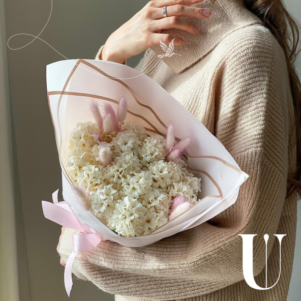 Монокопозиция из белой гипсофилы в глянцевой пленке