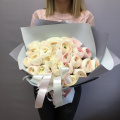 Мы перевяжем букет атласными лентами, упакуем в красивую бумагу и приложим карточку от вашего имени