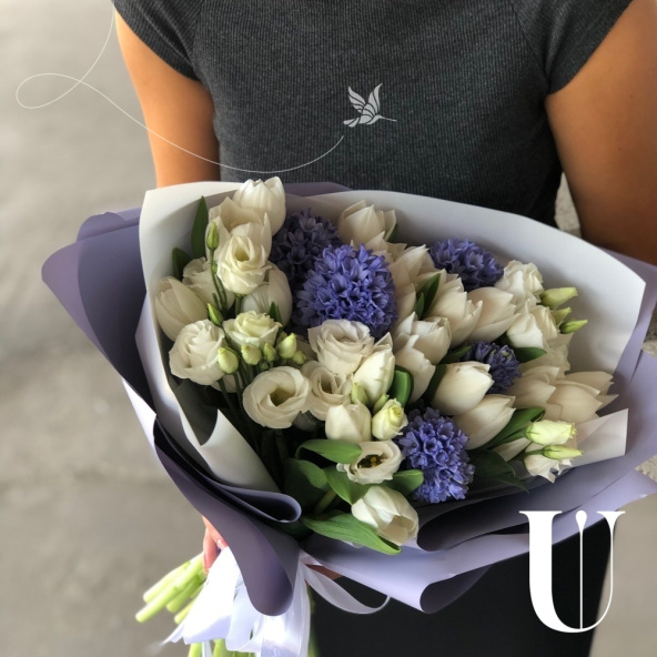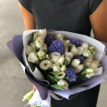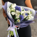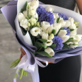 Монобукет из белых кустовых хризантем и фиолетовых эустом в упаковке