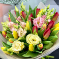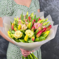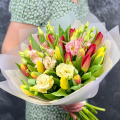 Букет в нежно-розовой гамме из роз и ранункулюсов в упаковке