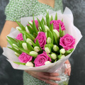Монобукет из розовых альстромерий в розовой упаковке