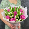 Букет из розовых кустовых пионовидных роз в упаковке