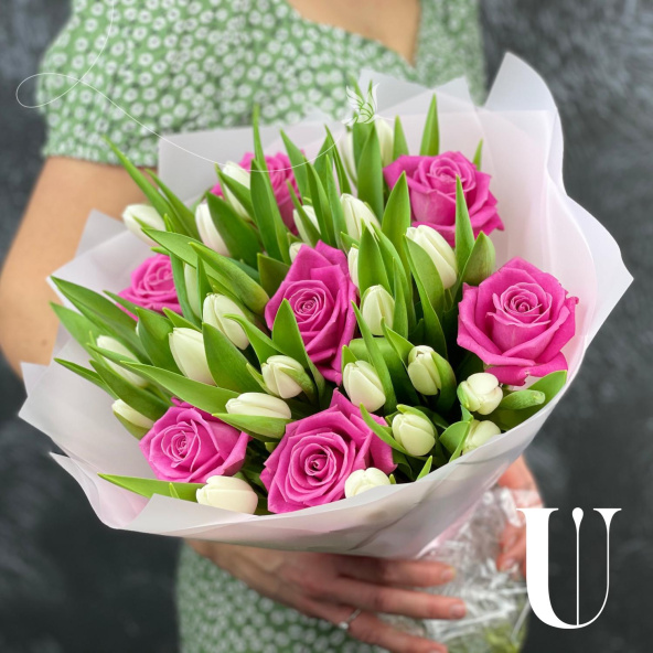 Большой букет из белых и розовых роз сорта Аваланж