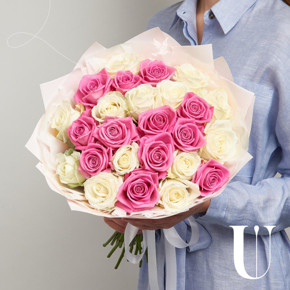 Монобукет из 51 красной и белой розы в розовой упаковке