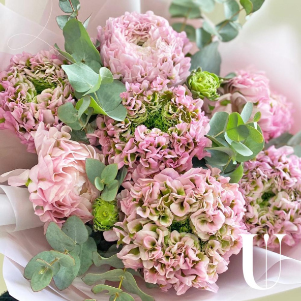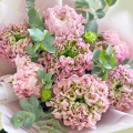 Монобукет из 5 розовых гортензий в дизайнерской упаковке
