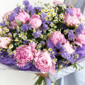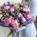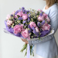 Букет из кустовых роз микс, эустом и розовой гортензии в упаковке