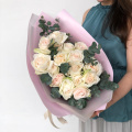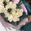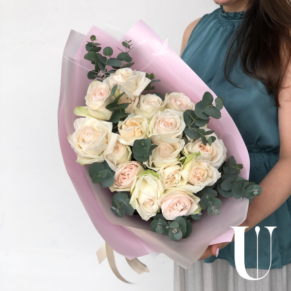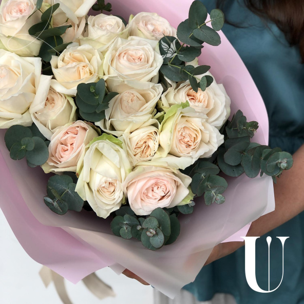 Восхитительная композиция из пионовидных роз в сочетании с эвкалиптом подарит получателю отличное настроение
