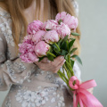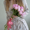 Монобукет из розовых кустовых пионовидных роз в упаковке