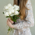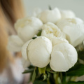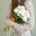 Букет из белых кустовых пионовидных роз сорта Бомбастик в упаковке