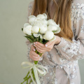 Монобукет из белых лилий и папоротника в белой упаковке